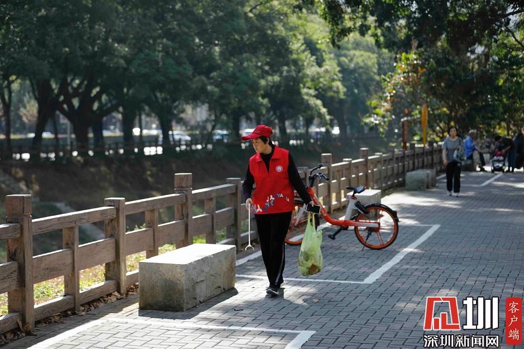 2019年11月22日,福田区新洲河旁,一位正在清理路面垃圾的义工。