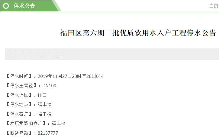 停水客户:加福大厦、丽港湾小区、朗庭小区、长宝大厦、保税区海关、边检、地铁工地宿舍