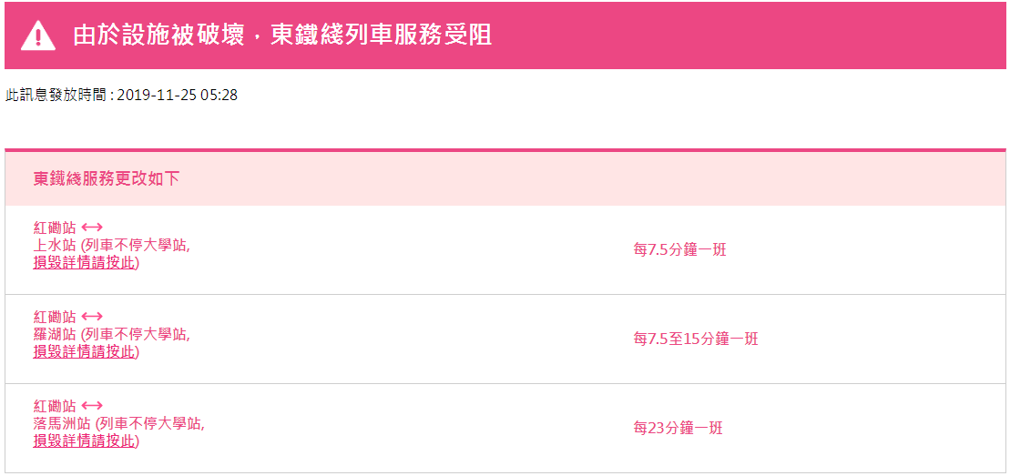 据港铁消息,11月25日,香港地铁各线(机场快线除外)、轻铁及港铁巴士的服务将于晚上11时结束。红磡站恢复列车服务,但只开放B、C出入口。大学站继续关闭,列车不停大学站,个别车站出入口也会暂时关闭。