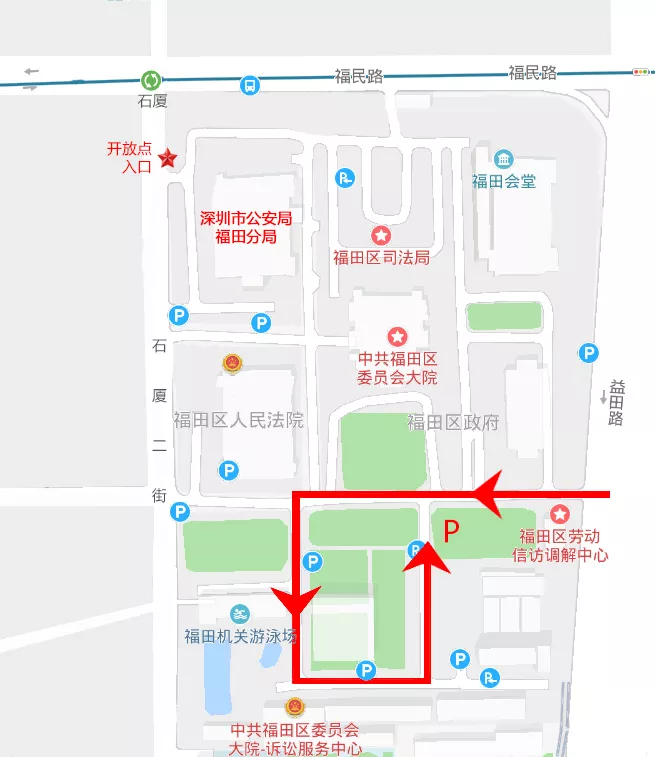 可乘坐公交线路:34路、73路、202路、303路、b689路、b957路、m133路、m389路、m390路,至福田区委站下车
