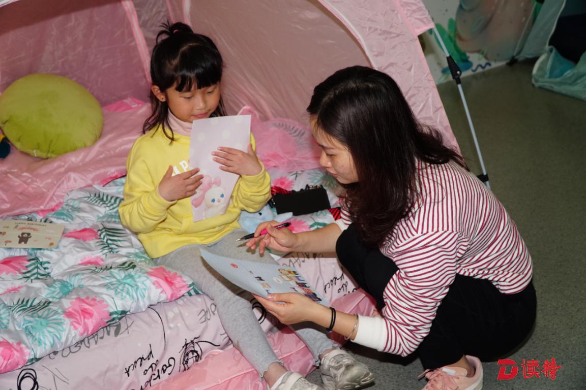 “写给十年后的自己”妈妈指导女儿写“梦想锦囊”的心愿。