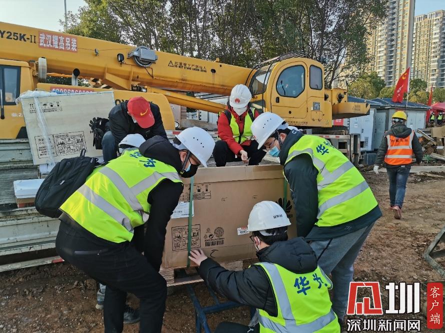 1月31日下午,华为网络、视频会议等设备紧急运输进场,准备施工调测 。 (华为供图)