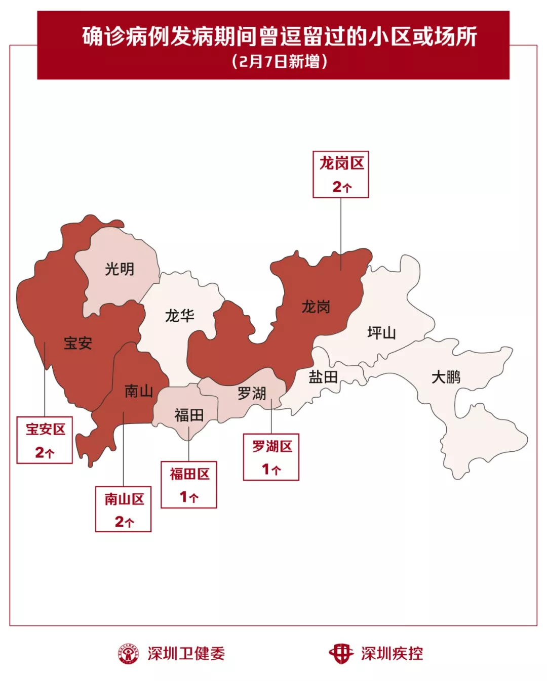 2月7日,疾控专业人员通过最新的流行病学调查确认,深圳新增8个小区(场所),有新确诊的病人在出现病征期间曾经逗留。
