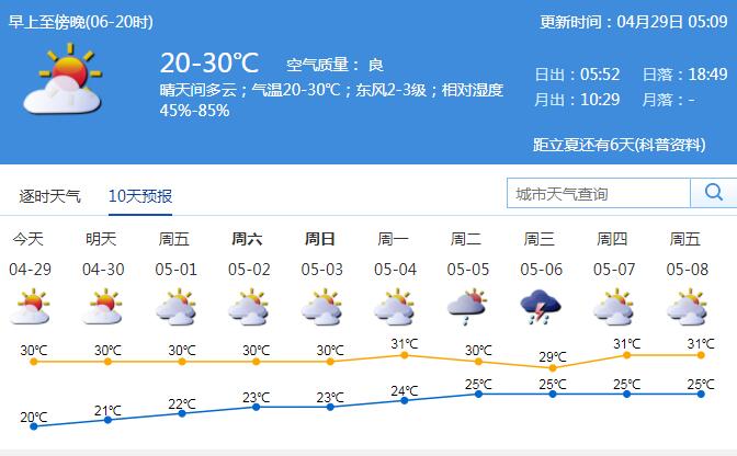 见圳客户端·深圳新闻网2020年4月29日讯 29日气温20-30℃,晴天间多云;东风2-3级,相对湿度45%-85%。展望五一假期期间(1-5日)天气总体平稳,多云间阴天,早晚有轻雾,间中有短时阵雨。