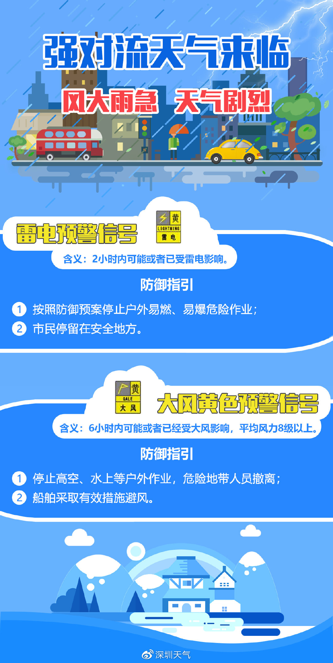 据深圳天气微博消息,过去1小时,大鹏新区和东部海区累计雨量已达暴雨,预计强降雨还将持续2-3小时,全市进入暴雨防御状态,请注意防御。中小学、幼儿园可视情况推迟上学。同时暴雨黄色分区、大风黄色、雷电预警正在生效中,请注意做好防御。