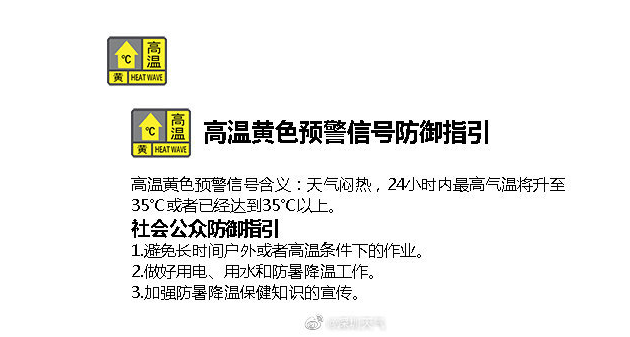 见圳客户端·深圳新闻网2020年06月12日讯 深圳市气象台于2020年06月12日08时00分在全市陆地发布高温黄色预警,预计12-13日深圳市最高气温将升至35℃以上,信号可能持续2天,做好防暑降温工作,避免长时间户外或者高温条件下的作业。