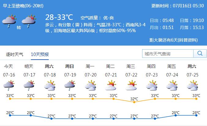 见圳客户端·深圳新闻网2020年7月16日讯 未来一周天气持续闷热。16日多云间晴天,有分散(雷)阵雨;气温28-33℃,中北部地区最高气温35℃左右;西南风3-4级,沿海、高地和海区最大阵风6级;相对湿度55%-90%。17日多云,间中有分散(雷)阵雨;18-22日晴天间多云,局地偶有(雷)阵雨。