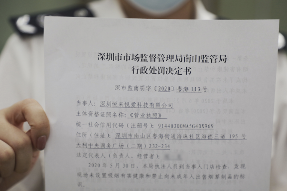 在深圳市市场监督管理局南山分局粤海所,记者看到企业法人现场接受行政处罚决定书,对于违法行为,该负责人表示“已经进行整改”。