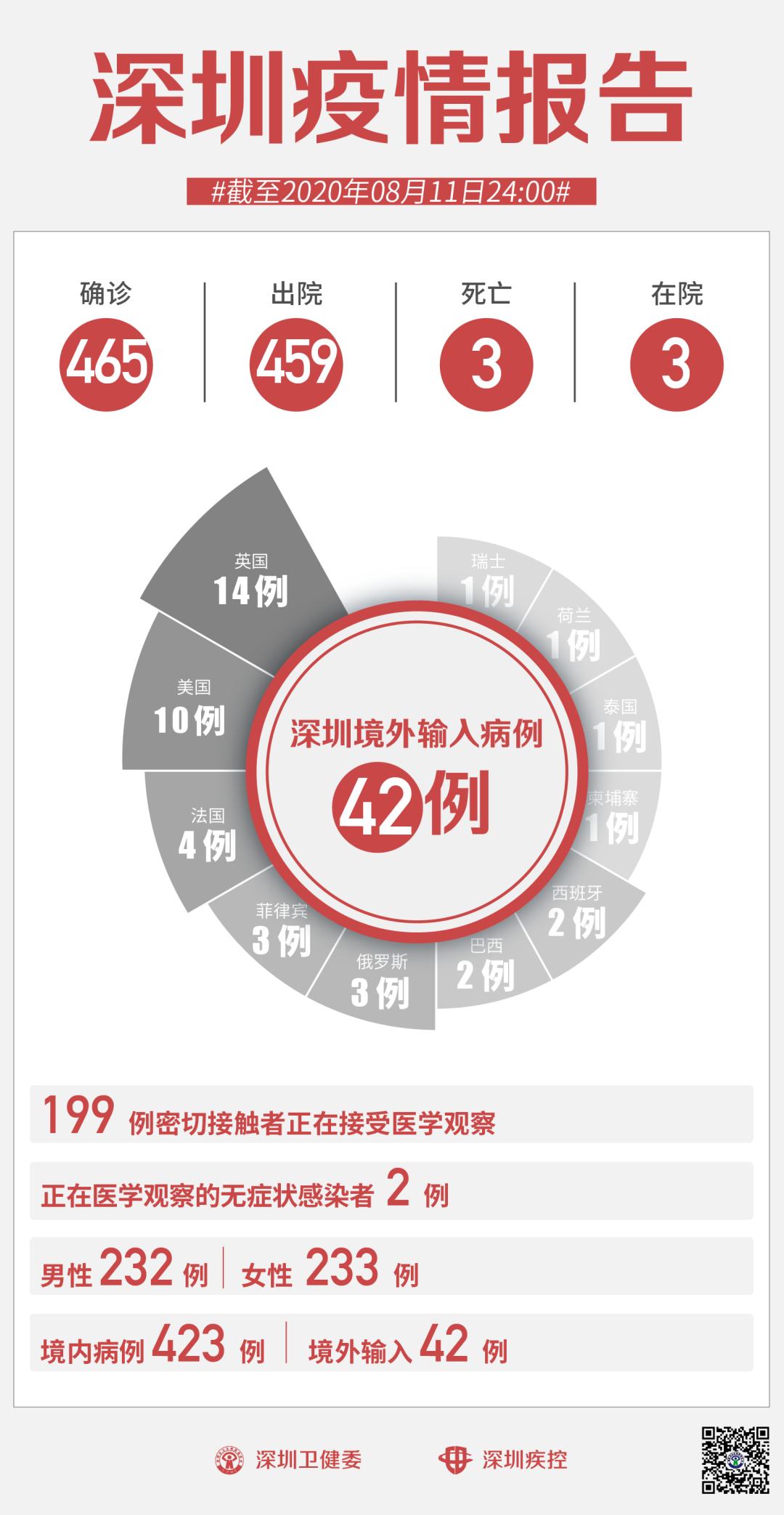 截至8月11日24时,深圳市累计报告新冠肺炎确诊病例465例。目前在院3例。