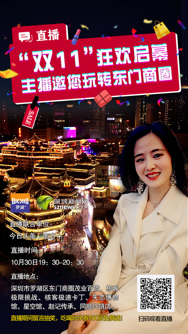 深圳新闻网讯(见圳客户端、深圳新闻网记者 李慧 刘晨)提前探秘经典活动“68小时不打烊”热潮、体验全亚洲最长的室内索道、打卡失恋博物馆、7D星空魔幻艺术馆、走进手冲姜撞奶的原创品牌糖水店、品尝深圳特产……10月30日(本周五)晚上7:30-8:30,由深圳新闻网联合深圳市罗湖区融媒体中心共同打造,联合今日头条、南方+直播平台,为市民开启东门商圈狂欢预热,解锁“双十一”嗨购方式,并在直播时段每隔20分钟抽取一次幸运网友,发放免费150张吃喝玩乐礼品券。