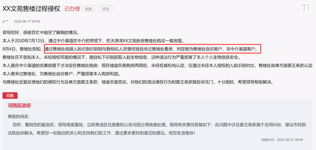 原来,一个月前,这位网友通过中介购买了XX文苑的一套房屋。但在8月4日,他被售楼处告知,售楼处的人脸识别系统曾经识别到与他相似的人独自看房,因此他属于自然到访客户,不属于中介渠道客户,不能享受渠道优惠。