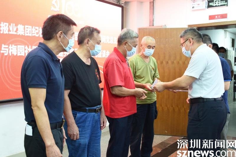 读特客户端·深圳新闻网2021年7月2日讯(记者 刘晨 见习记者 邱婕)为庆祝中国共产党建党100周年,共同促进党建共建单位友谊,7月2日上午,市纪委监委驻报业集团纪检监察组组长、报业集团党组成员陈鹏带领深圳新闻网党总支成员一行来到罗湖区清水河街道梅园社区,同梅园社区党委开展党建共建座谈会及慰问活动,并向“光荣在党50年”老党员颁发纪念章。