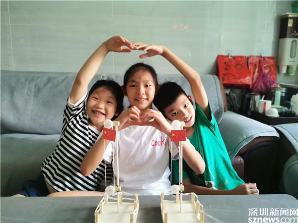 当天下午,20位回答了问题的小朋友得到了奖品,一个大大的工具包。他们要将工具包带回家,自己动手,拼装一个五星红旗升降台。吴燕柔姐弟三人第一个完成,他们一起在家中举行升旗仪式。姐姐慢慢摇动升降台的把手,三双大眼睛盯着冉冉升起的五星红旗,齐声唱响了国歌。姐姐升完了弟弟再升,三人轮流一番,国歌也就一遍遍响起。意犹未尽之际,姐弟三人还比了一个大大的心,与自己亲手制作的五星红旗升降台合影。