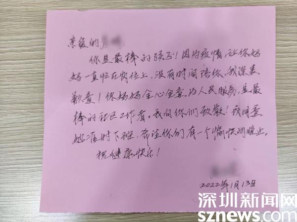 读特客户端·深圳新闻网1月13日讯(见习记者 覃钰清 通讯员 张晴晴)“亲爱的lín dǎo您好……我妈妈在您那工作,这些天都没能陪我,请你让她6点30分下班可以吗?”,1月13日,罗湖区南湖街道罗湖社区党委书记姜德荣收到了一封特别的来信。这封信来自社区工作人员彭女士可爱的女儿,信上的内容图文并茂,表达了一个10岁小女孩的小心愿,希望妈妈可以早点下班,回家陪她。