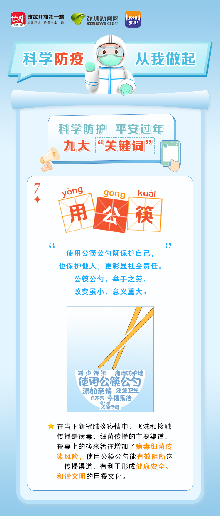 为更好地保护自己和他人的健康,度过一个祥和平安的春节,请查收《科学防护平安过年九大“关键词”》。在这场没有硝烟的战斗中,公安干警、医护人员、社区工作者、志愿者始终坚守在一线,齐心协力、众志成城抗击疫情。让我们携手并进,共同抗疫,采用科学有效的方式做好自身防护,不仅对自己负责,更是对家人负责,对社会负责。