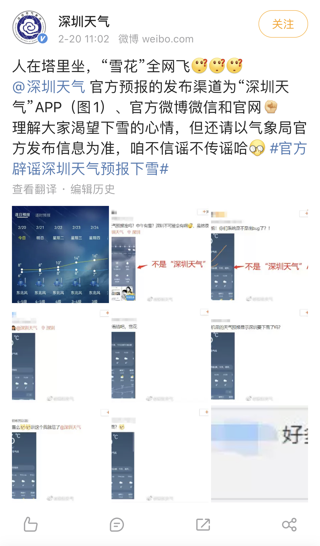 针对市民的疑问,中午11点左右,深圳市气象局官方微博“深圳天气”发布辟谣信息,官方并未发布降雪天气的预报。深圳市气象局在微博中表示:“@深圳天气官方预报的发布渠道为‘深圳天气’APP、官方微博微信和官网。理解大家渴望下雪的心情,但还请以气象局官方发布信息为准。“