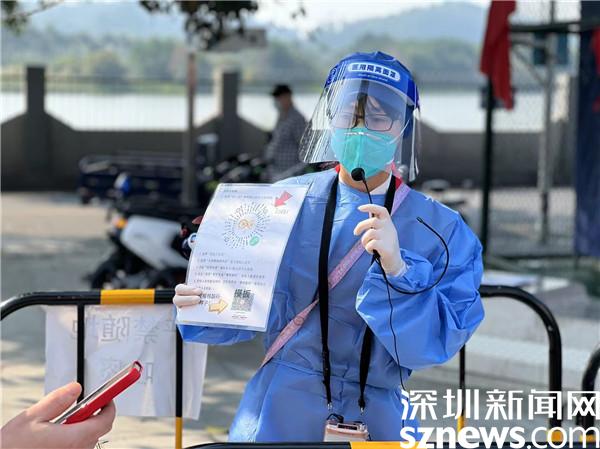 在大望体育公园核酸检测点,身穿蓝色防护服的吴连英举着核酸检测二维码,站在居民队伍中,一边耐心地引导居民操作,一边还不忘回答居民的问题。身材娇小的她,在队伍中站得笔直;眼疾手快的动作,是社工队伍里有名的“高效率”;和蔼可亲的语气,让居民们亲切地称呼她为“阿英”。