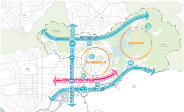 “一主”是以深南东路为中轴线,高起点打造总部经济主廊道。“两区”是高品质建设国际消费服务核心区和文化生态休闲区。“三带”是高能级规划深港口岸经济带、红岭新兴金融产业带和大梧桐新兴产业带。