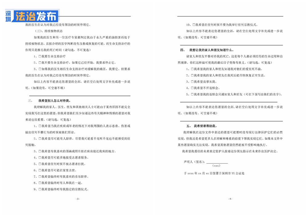 除了生前预嘱的3种情况外,杜芹律师公证的这份声明书,包含5个愿望清单①我要或不要什么医疗服务②我希望使用或者不使用生命支持治疗③我希望别人怎么对待我④我想让我的家人和朋友知道什么⑤我希望谁帮助我。