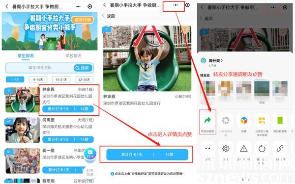 活动还将根据各学校的参与学生人数、学生打卡天数及总赞数对学校进行排名。通过对厨余垃圾分类的持续打卡,将推动学生养成厨余垃圾分类的习惯,并通过小群体辐射影响到社会广泛层面,提高罗湖区辖区厨余垃圾分类分出率,促成全民分类习惯养成,形成人人参与生活垃圾分类、人人宣传生活垃圾分类的社会氛围。
