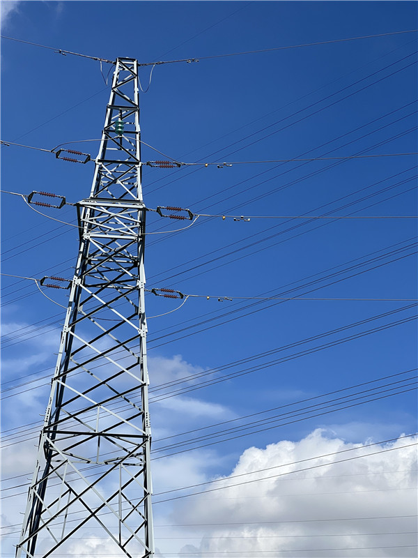 有序交错的电线杆,在蓝天白云的映衬下,显现出纵横交错的秩序美。