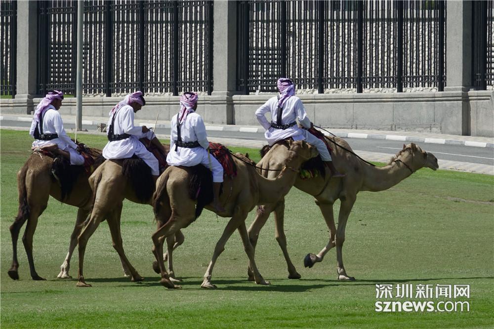 读特客户端·深圳新闻网2023年5月11日讯(记者 李晓蕾)在多哈海滨大道卡塔尔埃米尔宫(皇宫)旁的草坪上,每天都会有骆驼骑兵卫队的例行巡逻。李仁奇 摄