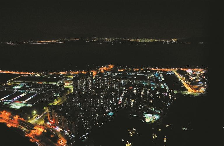 夜色中的深圳湾上空,远处的深圳湾公园进入“暗夜”。 深圳晚报记者 李晶川 摄