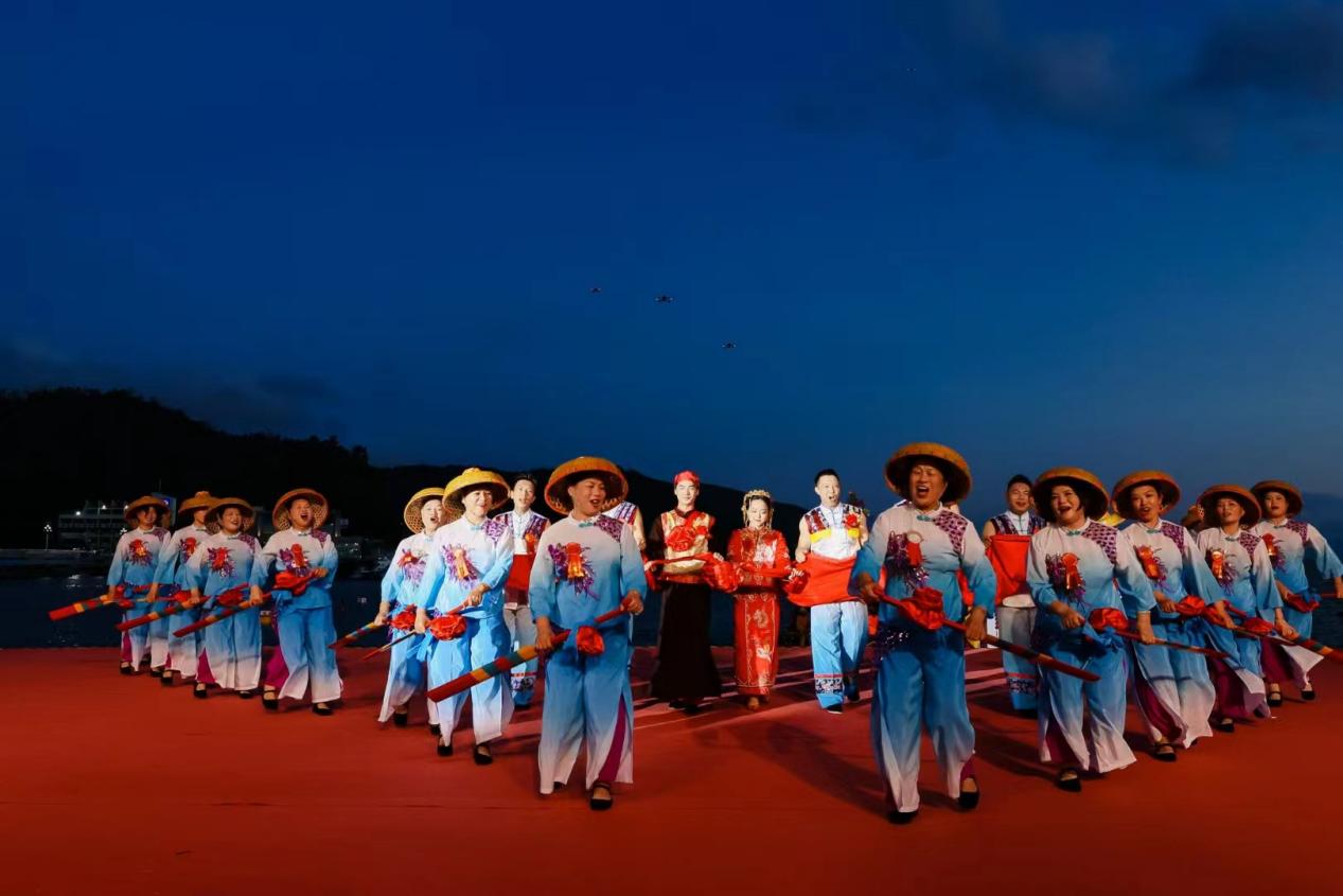 水上婚礼,是疍家民俗最独特的标志。旧时,盐田渔民以舟楫而居、以捕鱼为生,定亲、迎亲、洞房等仪式均在船上举行。渔民逐步移居岸上,婚俗有所改变,形成了一种渔民迎亲习俗舞蹈,即迎亲队伍模仿海上行船,在陆上作划桨舞蹈行进,且舞且进,看是无船胜有船。