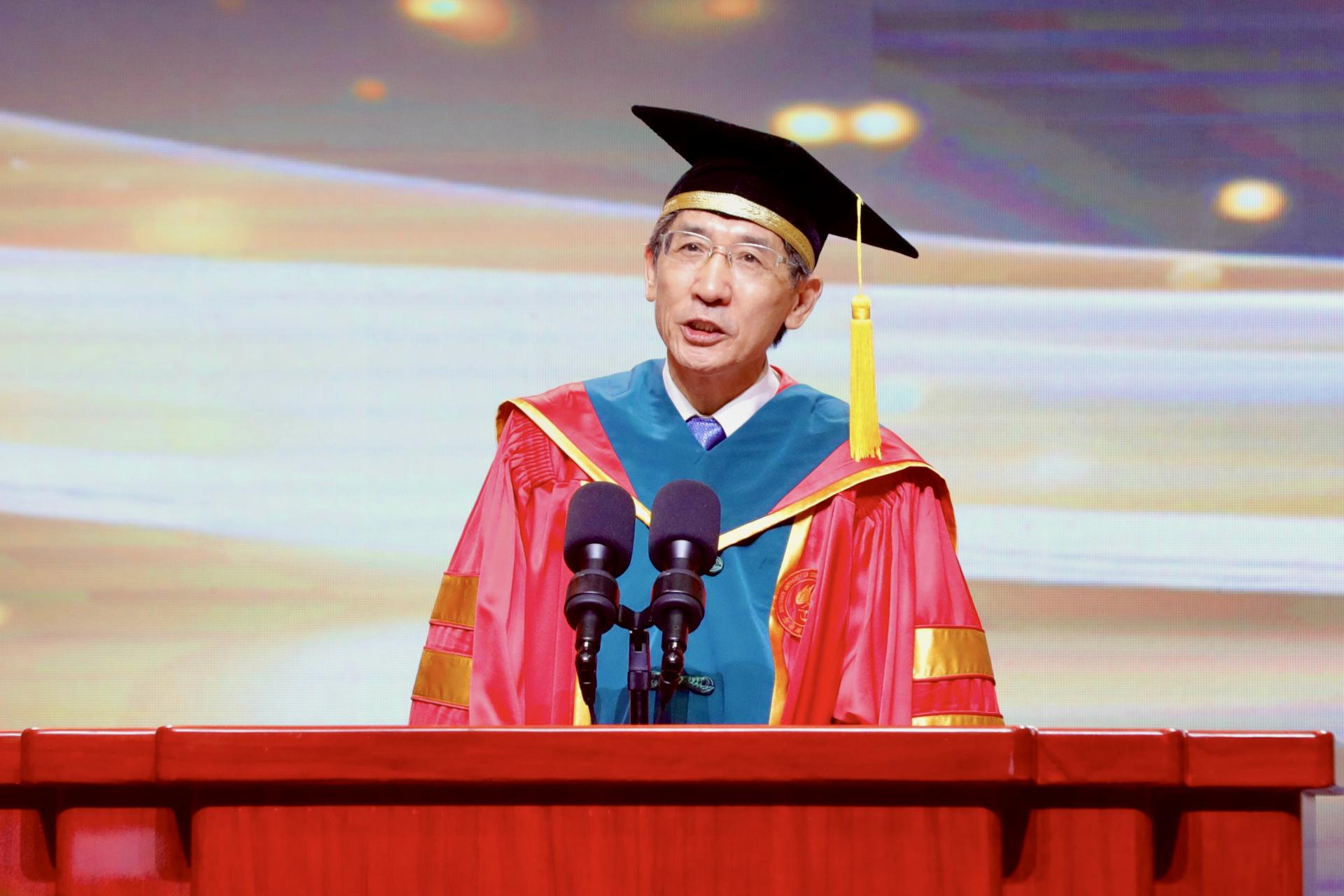 数载寒暑,流金岁月。在过往几年的南科大时光中,同学们秉承“明德求是、日新自强”的校训精神,开拓进取、勇往直前,与学校共命运和时代同发展,完成了梦想与现实的双向奔赴,也实现了个人与集体的相互成就。今年4月,生物系研究生第二党支部成功入选“全国党建工作样板支部”培育创建单位,彰显了你们厚植家国情怀、积极弘扬科学家精神的主动追求和责任担当;刚刚发言的环境科学与工程学院2020级的戴艳会同学荣登《人民日报》发布的“研究生国家奖学金获奖学生代表名录”,成为中国优秀青年的代言人,展现了我们南科大学子的风采;统计与数据科学系2022级的邓春丽同学荣获共青团中央颁发的“中国青年志愿者优秀个人奖”,在联合国驻塞尔维亚驻地作为中国一名志愿者传递南科大人的大爱精神。今年我校研究生毕业生的去向落实率位居广东省前列,这实属不易,是同学们长期奋斗的结晶,也是同学们对母校最好的回馈。研究生是教育体系中的最高学历,代表着你们已经接受了最高程度的教育。今天在场的每一位毕业生,你们用自己的成长、成绩和成功,完美阐释了在中国“双一流”大学接受了最高程度教育的学子应有的风范。作为你们的校长,我感到无比的骄傲与自豪。你们激扬的、奋进的、动人的青春故事,书写在学校的每一次发展进步中,成为南科大历史长卷开篇的重要部分,将激励和引领后来者不断前行。