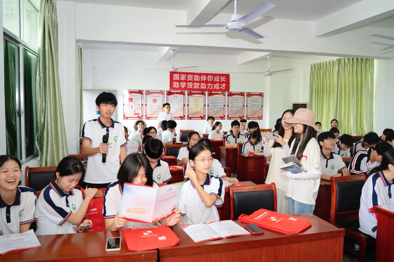 管理学院宣讲团队的队员李小珠、郑梓桐是陆河籍学子,他们回到母校河口中学,以亲身经历为同学们答疑解惑,让同学们倍感亲切。数字媒体学院宣讲团队在螺溪镇的宣讲活动中,为参与者准备了队员们手绘的文创产品,一件件手工制品饱含着宣讲团队对莘莘学子的美好祝福。