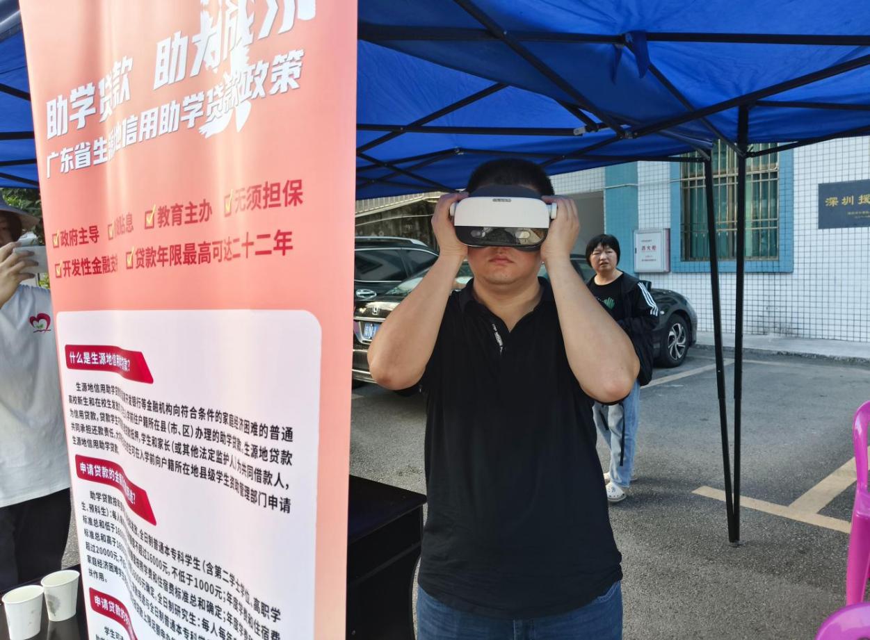 计算机学院宣讲团队还结合专业特色,在东坑镇宣讲活动中设置游戏及VR体验区,利用VR技术与资助宣传视频结合,提升资助宣传效果,让参与者沉浸式感受国家资助政策对困难家庭的学子在求学路上的帮助,受到了大量村民们的好评,极大地增强了村民们对政策的知晓度与理解力。