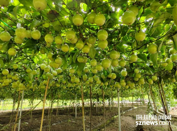 深圳新闻网2024年8月1日讯(记者 罗慧琳)眼下,正值百香果成熟的季节,蕉岭县广福镇叶田村又飘果香。走进该村百香果基地,绿意映入眼帘,一个个浑圆饱满的果实犹如小灯笼般缀满藤条,在阳光的映衬下闪烁着动人光泽,空气中充盈的淡淡果香更是令人垂涎欲滴。连日来,每天一大早,该村党总支部委员、村委会副主任杨诚就带领数名村民在基地里忙活开来:观察病虫害、除草追肥、精选采摘……一干就是一整天。