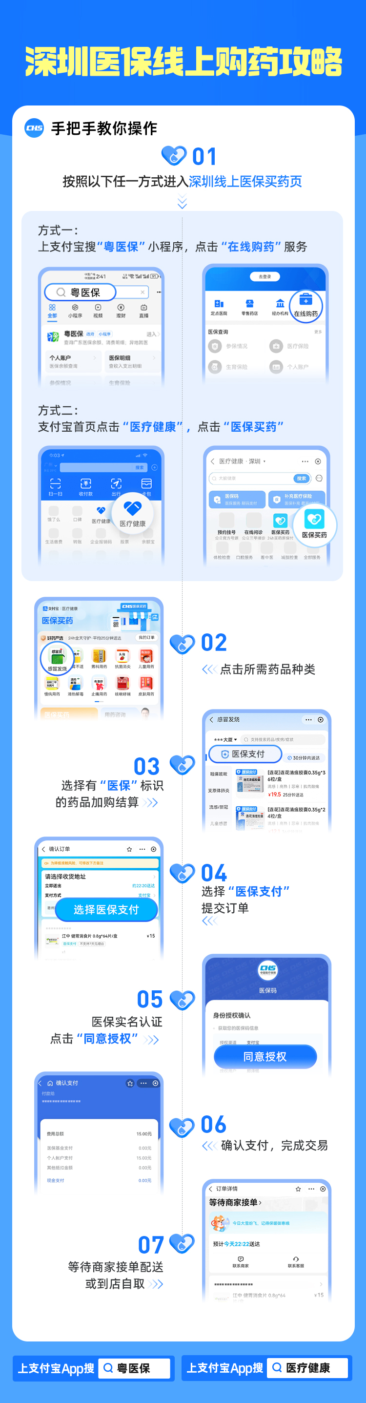 参保人可以登录支付宝APP,搜索“医疗健康”,进入“医保买药”专区,认准带有“医保商品”标识的药品下单。在选择“医保支付”后,根据提示完成医保码的激活认证和移动支付授权,即可完成支付结算。此外,参保人还可以在支付宝内通过“粤医保”支付宝小程序或者“海王星辰”“叮当快药”等药店官方小程序及“饿了么”小程序等渠道进行线上买药。
