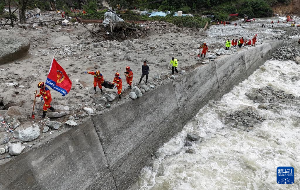 8月4日,在四川甘孜州康定市姑咱镇日地村,救援人员搜救失联人员(无人机照片)。新华社记者 刘坤 摄