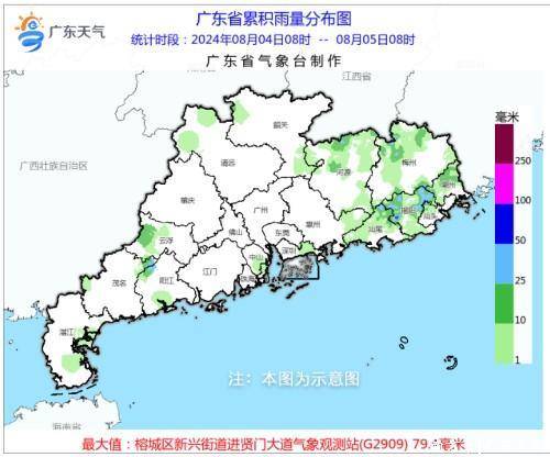 天气实况:4日白天到5日早晨,广东大部晴到多云,午后粤东、梅州、河源出现了雷阵雨局部大雨或暴雨,雷雨时伴有7级~9级短时大风和局地小冰雹,有7个镇街录得超过50毫米的暴雨,各市雨量最大的镇街有:揭阳榕城区新兴街道79.4毫米、梅州平远县石正镇54.7毫米等。
