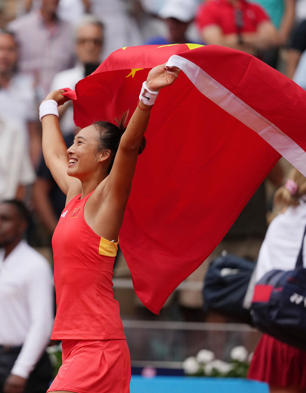郑钦文夺冠后举起国旗庆祝。(图源:新华社)