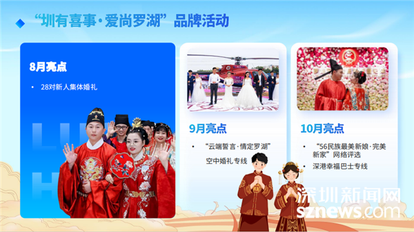 七夕佳节近在咫尺,罗湖融合喜事经济和珠宝文化,热闹启动“圳有喜事·璀璨水贝”嘉年华。8月将召集28对新人参与一场别具一格的集体公益婚礼,9月将推出空中婚礼专线,10月将启动“56民族最美新娘·完美新家”网络评选,并开通深港幸福巴士,在口岸接送香港新人,体验罗湖喜事经济。