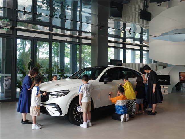 接着,孩子们来到了奔驰VIP体验馆。为了激发孩子们的创意,胡总特意调来了一台白色奔驰,供孩子们进行绘画创作。在这辆奔驰车上,孩子们用色彩描绘出了自己的梦想,以及奥运健儿夺冠的激动场景,整个体验过程充满了童真与激情。