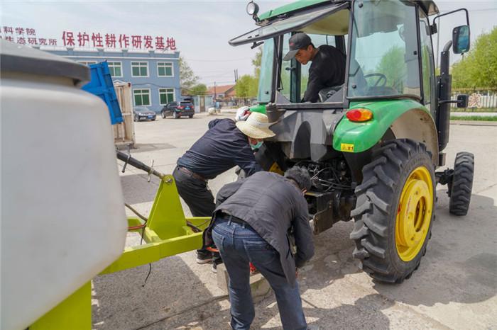 △在吉林省四平市梨树县康达农机农民专业合作社,农民在调试免耕播种机。