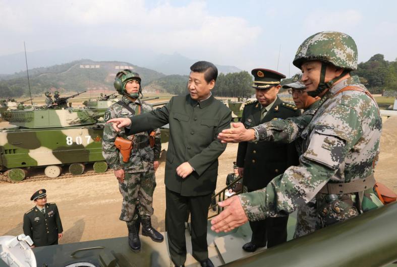 2012年12月10日,习近平在广州军区某部训练场,登上两栖突击车了解装备情况