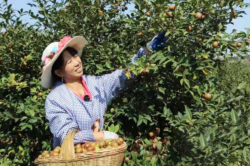 村民在司马光油茶园核心区联兴万亩油茶生态示范基地采摘油茶果。