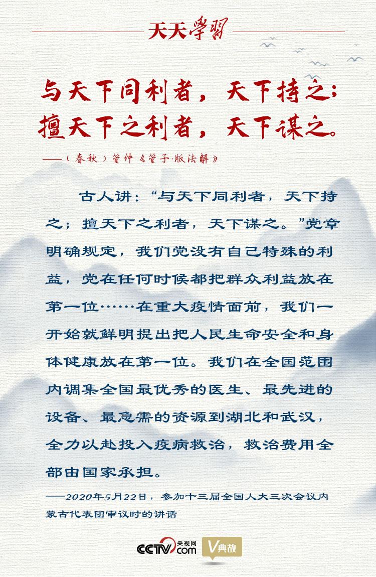 “不惜一切代价!”2020年5月22日,习近平总书记参加十三届全国人大三次会议内蒙古代表团审议,在谈及保护人民生命安全和身体健康时掷地有声地说。他在此引用了“与天下同利者,天下持之;擅天下之利者,天下谋之”这句古语,强调我们党没有自己特殊的利益,党在任何时候都把群众利益放在第一位。这是我们党作为马克思主义政党区别于其他政党的显著标志。
