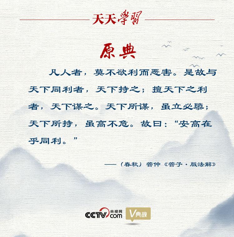 “利民”是管子民本思想的重要内容。管子认为,“得人之道,莫如利之”,强调治国者必须善于与民同利。他从人的自然本性加以阐述,“凡人者,莫不欲利而恶害”,认为趋利避害是人的本能。因此,“与天下同利者,天下持之;擅天下之利者,天下谋之”。与天下人同利的,天下人就拥护他;独占天下人利益的,天下人就图谋他。管子的上述观点是对姜尚“同天下之利者,则得天下;擅天下之利者,则失天下”思想的继承。