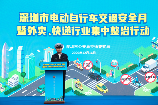 12月16日下午,深圳交警在罗湖区东门文化广场举行深圳市电动自行车交通安全月暨外卖、快递行业集中整治行动启动仪式。