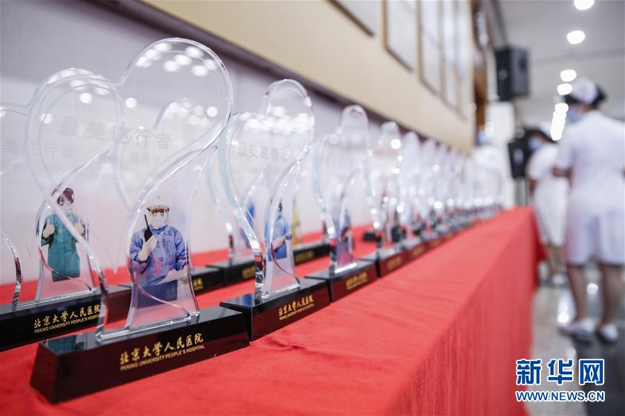 5月11日,工作人员整理印有援鄂队员工作照的奖杯。在国际护士节到来之际,北京大学人民医院11日举办庆祝护士节暨优秀集体和个人表彰活动,并邀请援鄂医疗队护士代表分享战“疫”故事。我国今年护士节的主题为“致敬护士队伍,携手战胜疫情”。新华社记者张玉薇摄