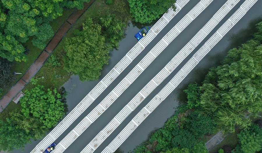 在益阳市大通湖区东大堤附近水域,一艘船采取“以船代仓”方式储备防汛物资。