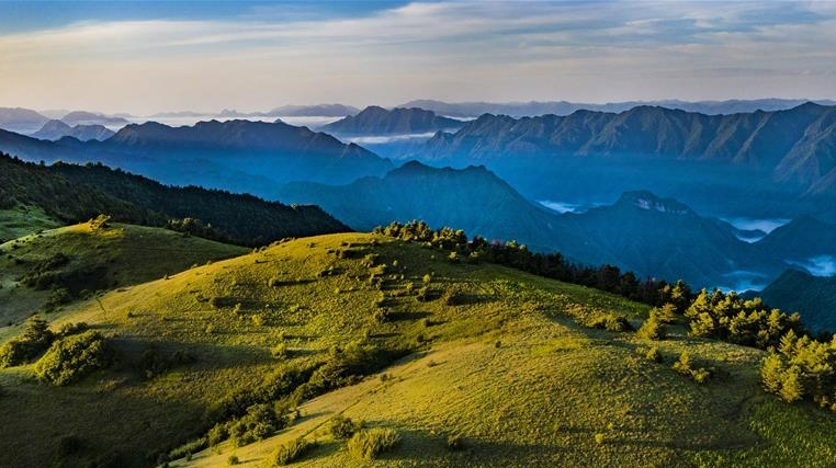 夏日的朝霞中,起伏的草甸仿佛一块宽大无边的绿色地毯,镶嵌在大巴山上,如诗如画。