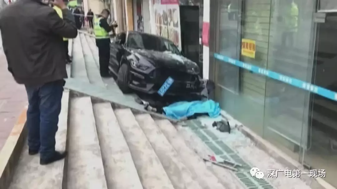 深广电第一现场2019年1月22日讯 21日早上8时12分,龙岗区横岗街道力嘉路109号附近有一辆黑色福特野马轿车突然失控冲向人行道撞倒数名行人后越过阶梯,撞停在一家餐饮店门口。其中,一名女子被撞不幸身亡,记者在现场看到了女子的丈夫,他告诉记者,就在事故发生前几天,妻子还说要一起回老家过年的。