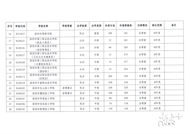 记者梳理发现,目前,深圳市共有16所普高尚有扩招及补录计划,补录人数2430人,最高补录分数线为377分。此外,全市还有4所中职学校与7所中技学校进行扩招与补录,补录人数共1367人,最高补录分数线为316分。