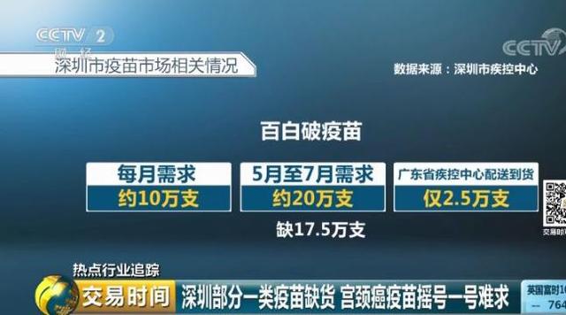 据深圳市疾控中心介绍,深圳市百白破疫苗每月需求约10万支,5月至今需求约20万支,广东省疾控中心配送到货仅2.5万支,缺口巨大。